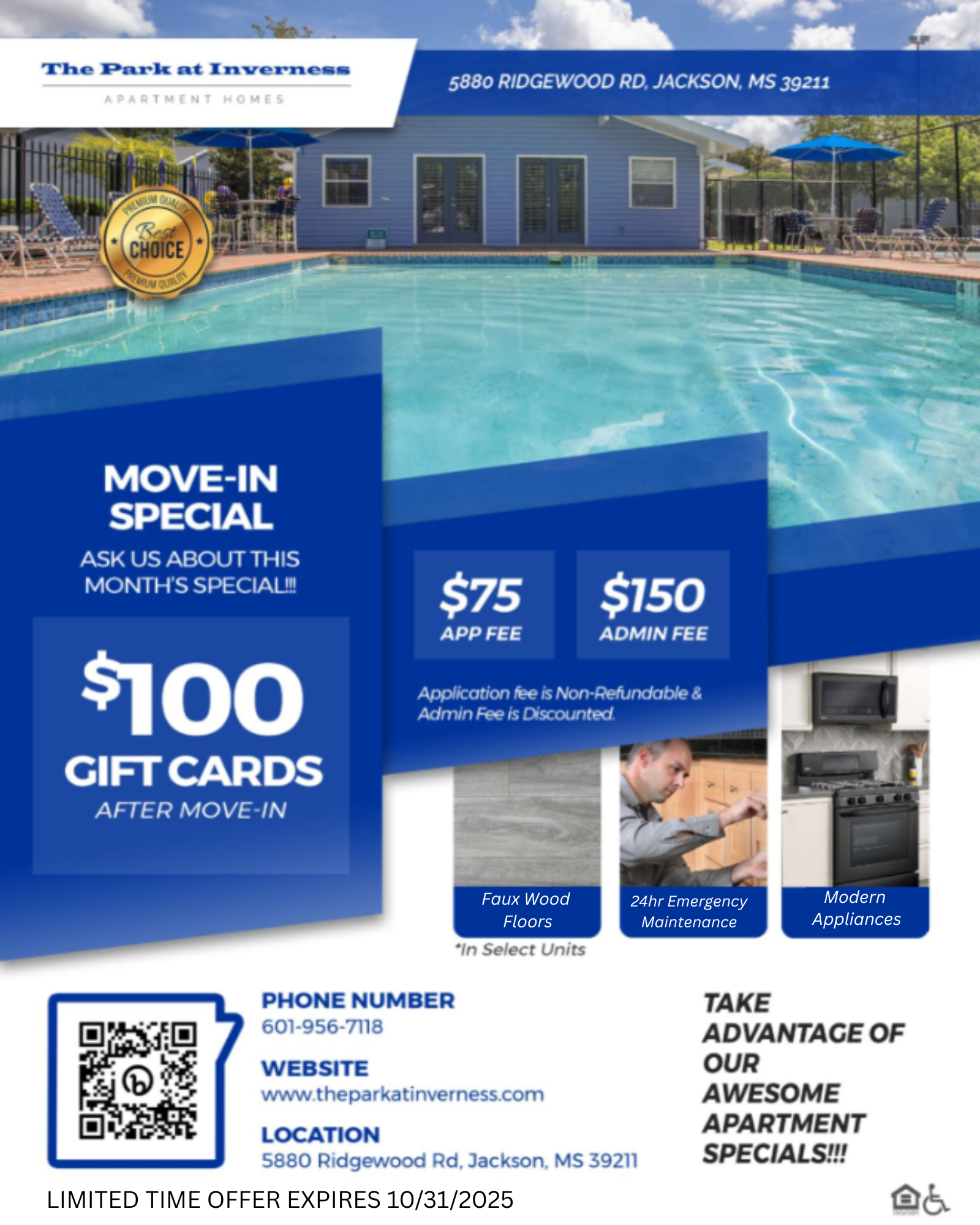 The Park at Inverness apartments were designed to enhance your comfort by offering spacious and open-designed floor plans with one, two, and three bedroom apartments for rent in Jackson, MS. Each apartment comes equipped with a personal patio or balcony, heating, and air conditioning, faux hardwood flooring, walk-in closets, and washer and dryer connections. Entertaining is a breeze with the all-electric kitchen with a dishwasher and a refrigerator to help make your everyday life easier. The Park at Inverness provides accommodations that define the difference between a place to live and a place to call home.